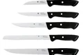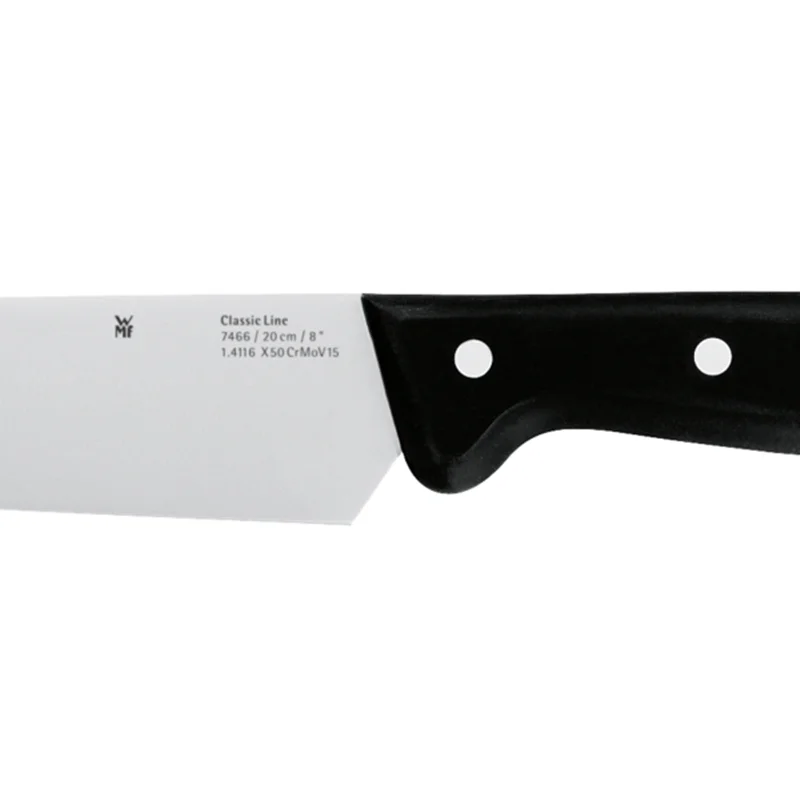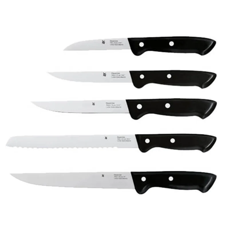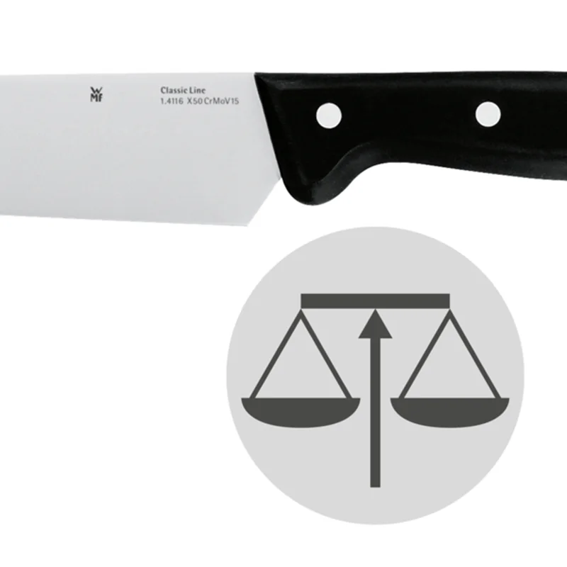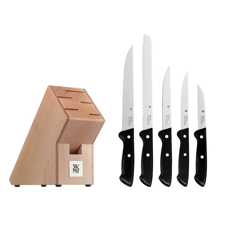 سرویس چاقو های وی ام اف با استفاده از بالاترین و مجهز ترین تکنولوژی ساخته شده اند و به دلیل کارایی و زیبایی آنها، در نوع خود بینظیر هستند. تیغه های آنها از استیل و فولاد کرومارگان ساخته شده است و استند زیبای آن نیز از چوب راش ساخته شده است که در زیبایی آن سهم بسیاری دارد. سرویس چاقو مدل Set of kitchen knives CLASSIC LINE 6-pc شامل پنج عدد چاقو و یک استند است و میتوان از آنها برای بریدن نان، گوشت، سبزیجات و استیک استفاده کرد.