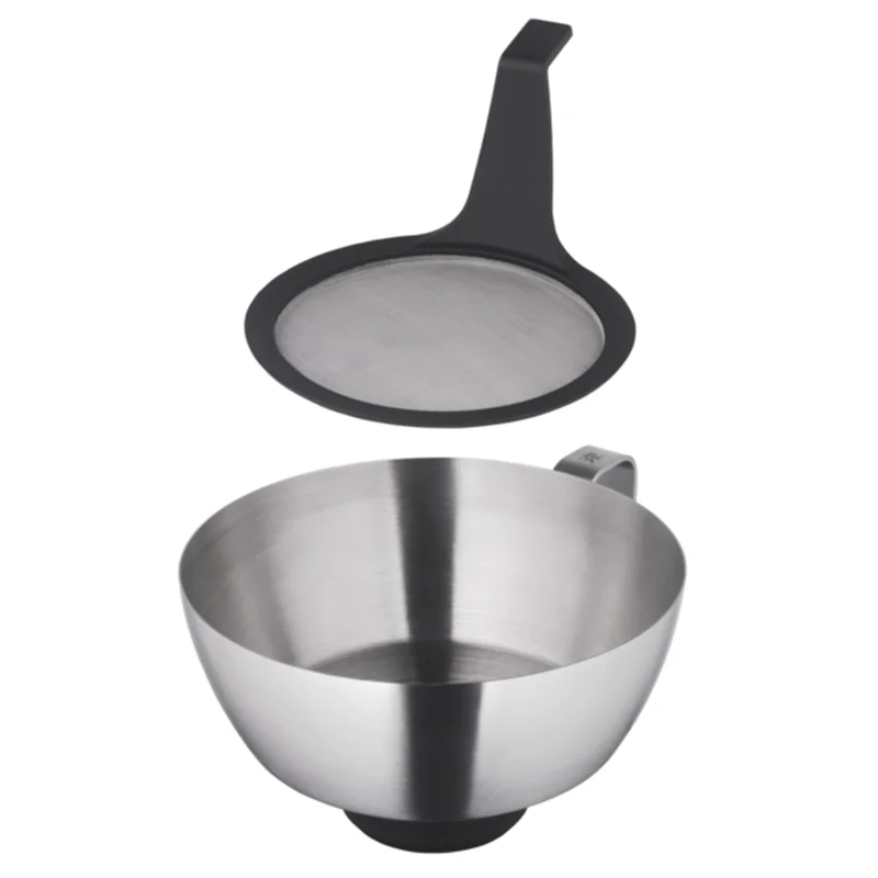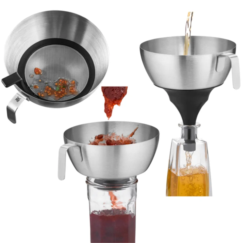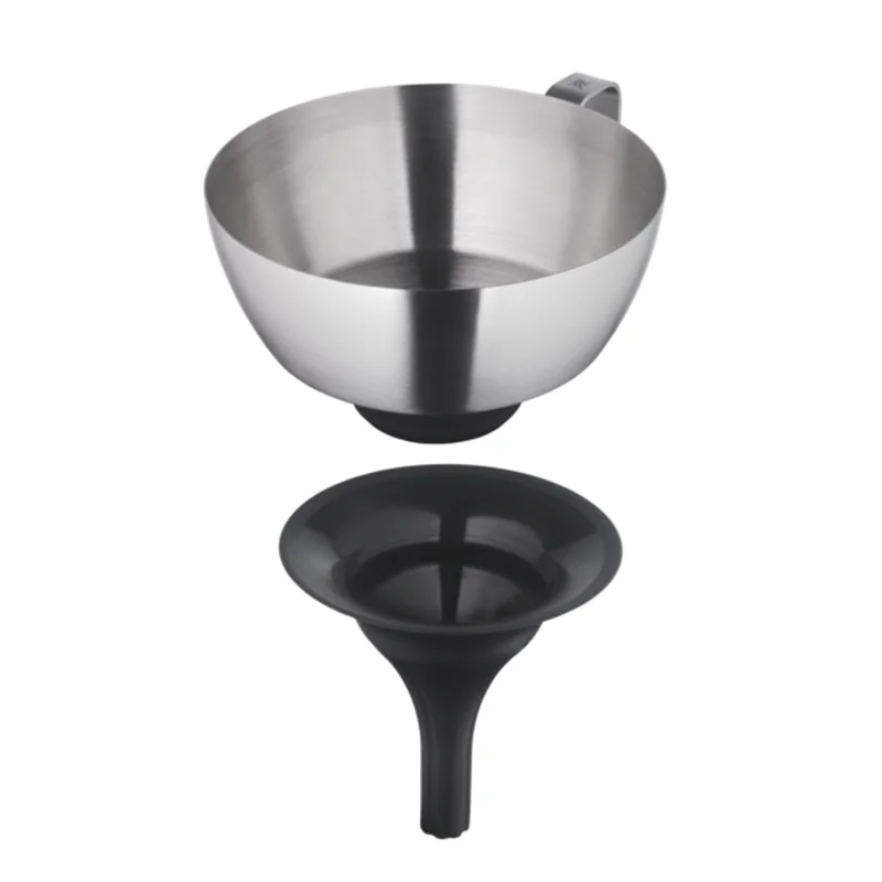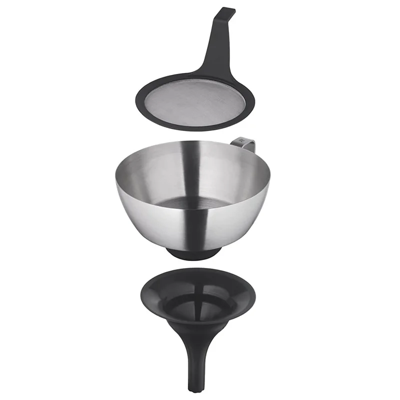 قیف وی ام اف مدل WMF Multi function funnel به عنوان یک صافی 3 در 1 با عملکردهای پر کردن، کاهش حجم و الک کردن مناسب برای موادی مانند روغن، سس، مربا، شکر و آرد است. شما میتوانید از این صافی هوشمند، برای انجام دقیق تر، سریع تر و بهتر از کارهایی مانند پر کردن و کاهش حجم مواد استفاده کنید. همچنین، این صافی با استفاده از مواد با کیفیت و بادوام، قابلیت آسیاب نمک و فلفل و حتی آرد نان را نیز دارد. به طور کلی، با توجه به ویژگیهایی که شما ذکر کردید، این محصول به عنوان یک ابزار چندکاره و هوشمند، میتواند برای مصارف خانگی و حرفهای بسیار مفید باشد.